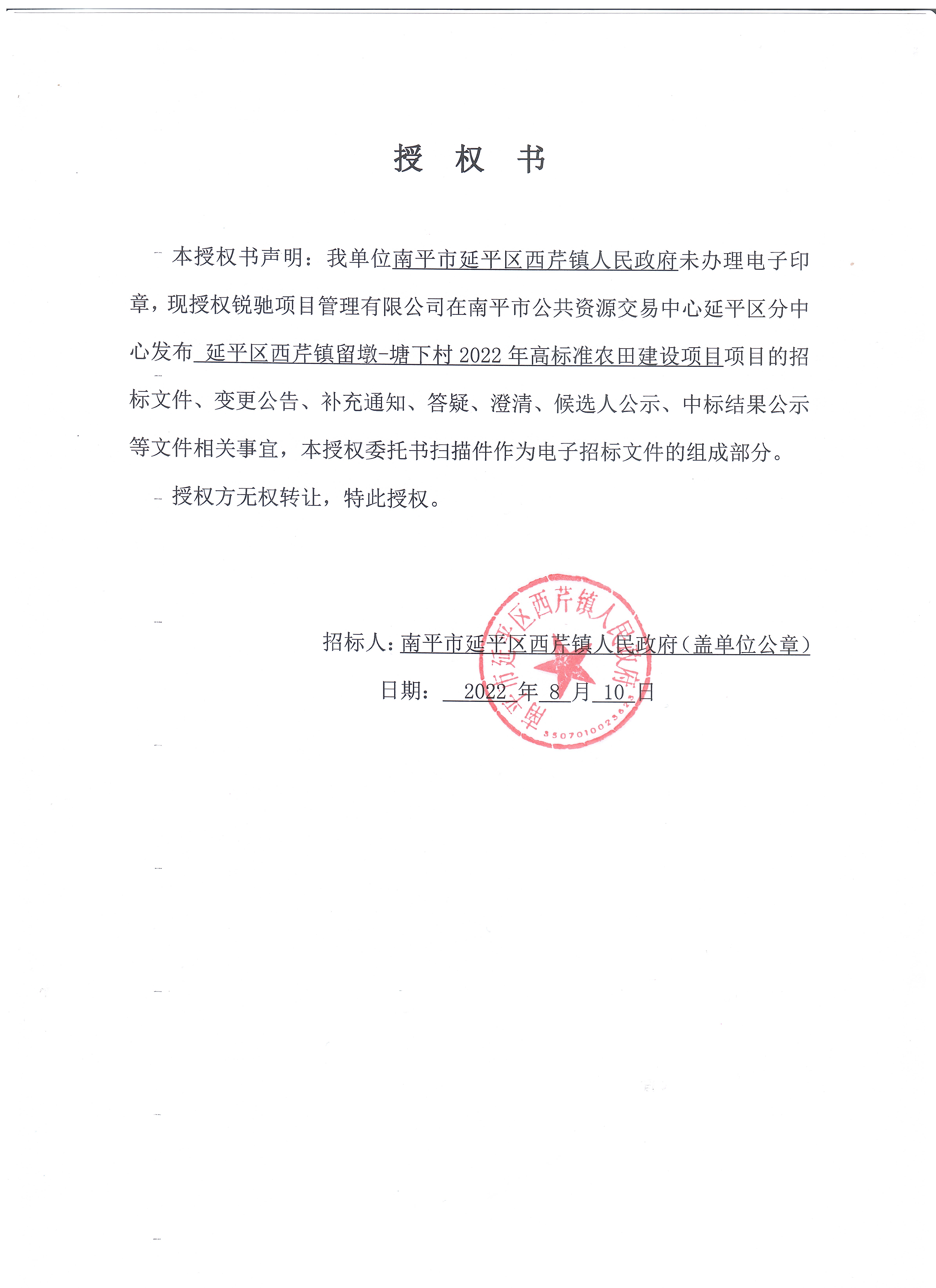 本招标项目延平区西芹镇留墩-塘下村2022年高标准农田建设项目(项目名称)已由南平市农村农业局(项目审批、核准或备案机关名称)以《南平市农业农村局关于2022年第三批高标准农田建设项目初步设计的批复》南农【2022】67号(批文名称及编号)批准建设,项目业主为南平市延平区西芹镇人民政府,建设资金来自上级拨款(资金来源),出资比例为100%,招标人为南平市延平区西芹镇人民政府,招标代理单位为锐驰项目管理有限公司。项目已具备招标条件,现对延平区西芹镇留墩-塘下村2022年高标准农田建设项目(标段名称)施工进行公开招标。