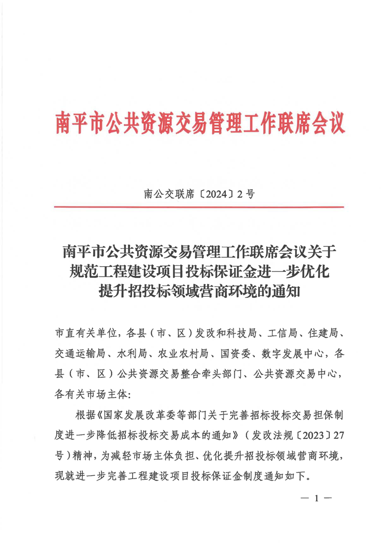 南平市公共资源交易管理工作联席会议关于规范工程建设项目投标保证金进一步优化提升招投标领域营商环境的通知