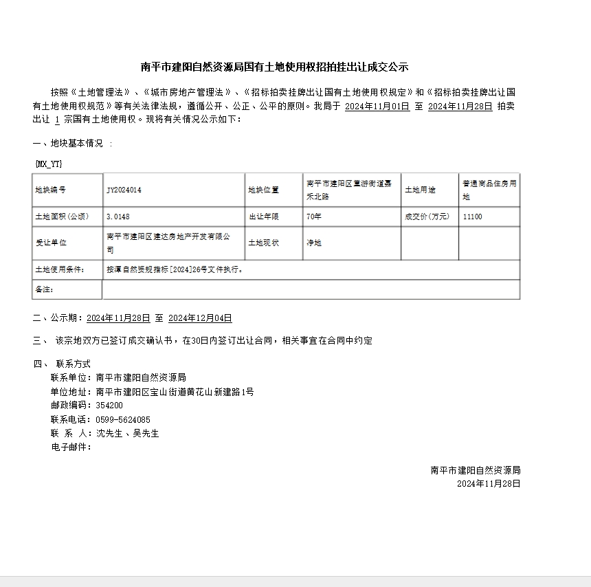 南平市建阳区自然资源局2024年11月01日至2024年11月28日国有土地使用权招拍挂出让成交公示