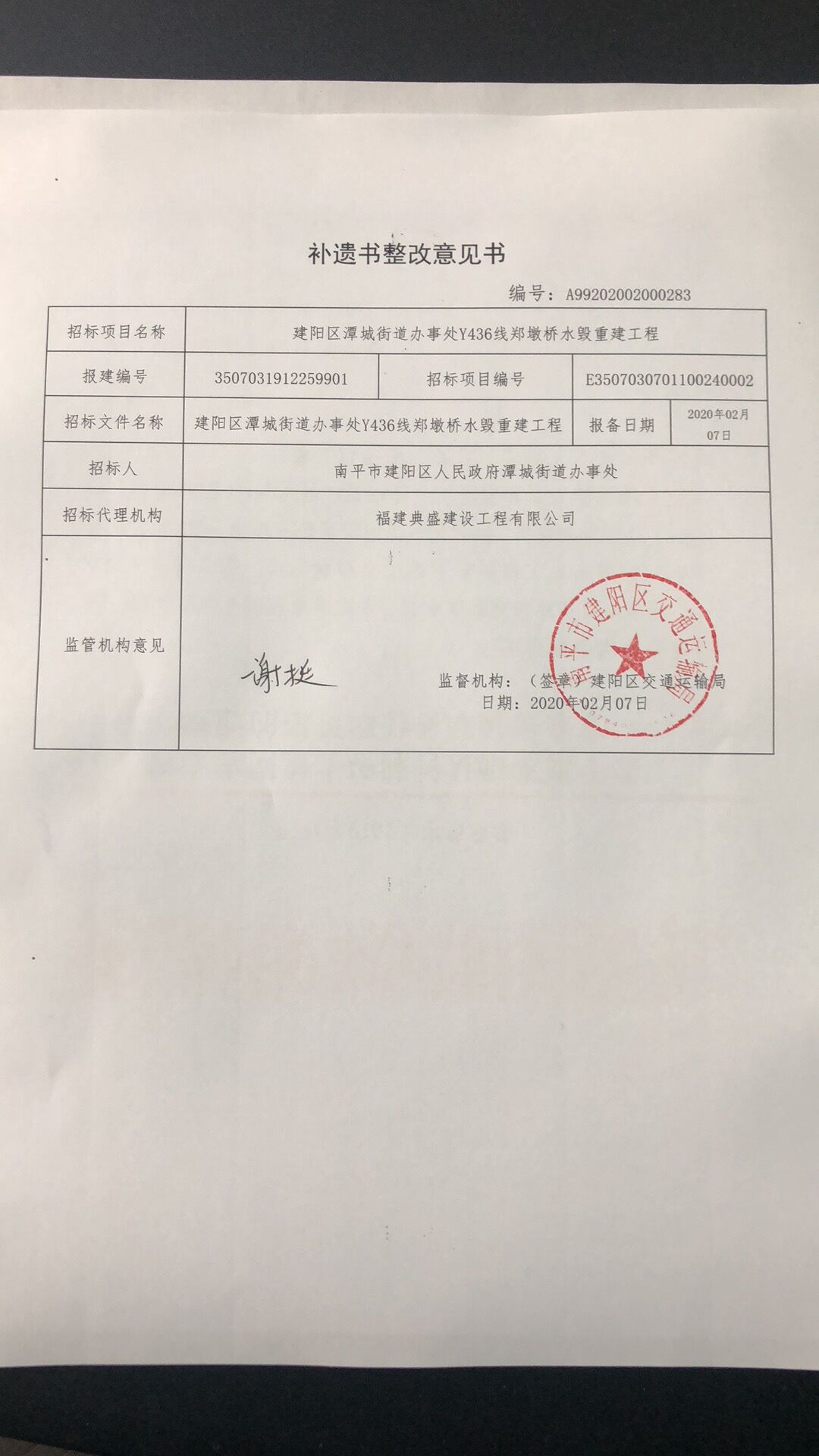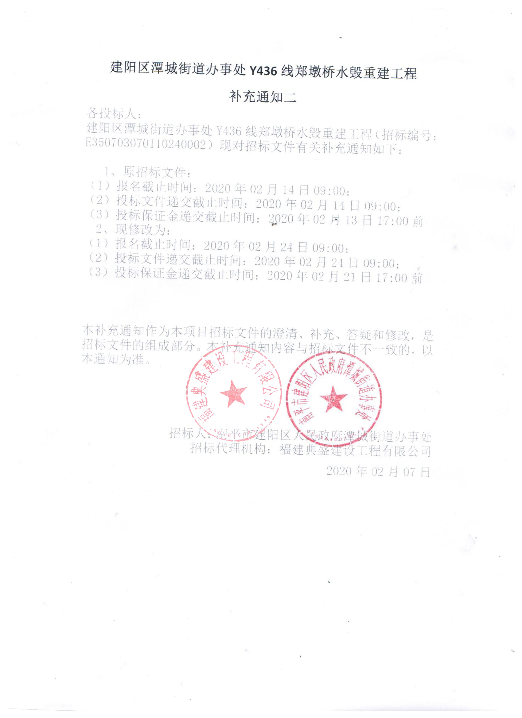 建阳区潭城街道办事处Y436线郑墩桥水毁重建工程(招标编号:E350703070110240002)现对招标文件有关补充通知如下: