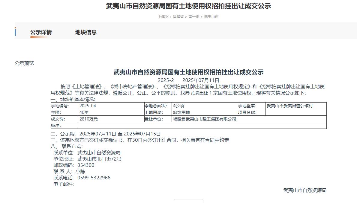 武夷山市自然资源局国有土地使用权招拍挂出让成交公示