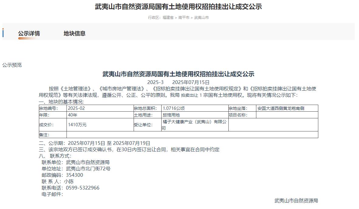 武夷山市自然资源局国有建设用地使用权招拍挂出让成交公示