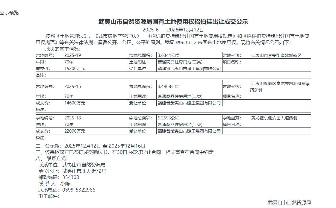 武夷山市自然资源局国有土地使用权招拍挂出让成交公示