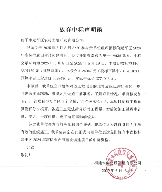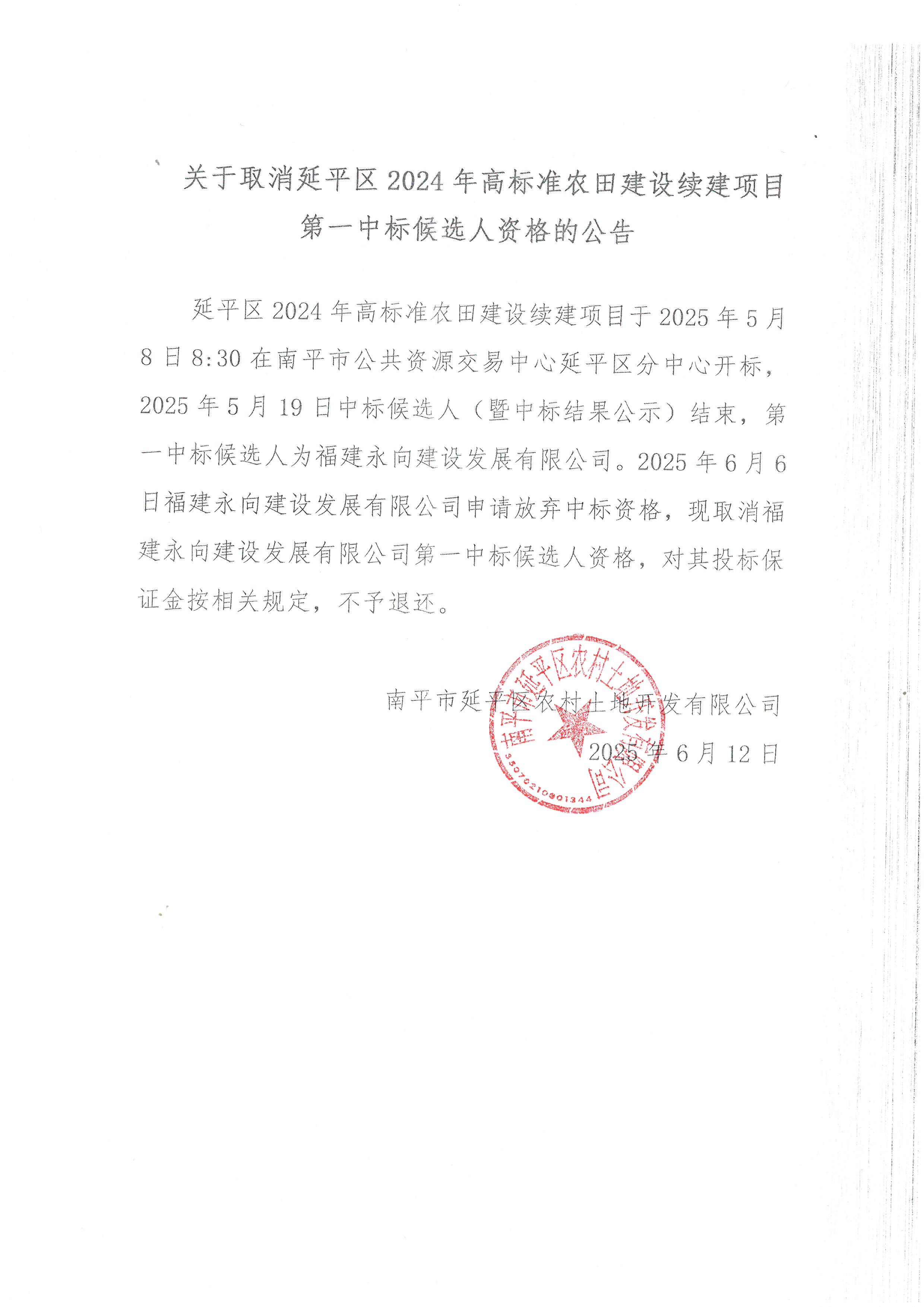 关于取消延平区2024年高标准农田建设续建项目第一中标候选人资格的公告