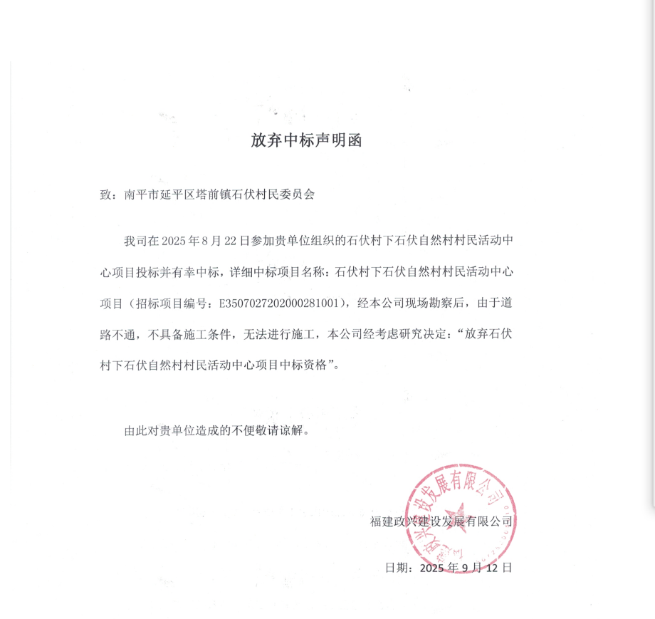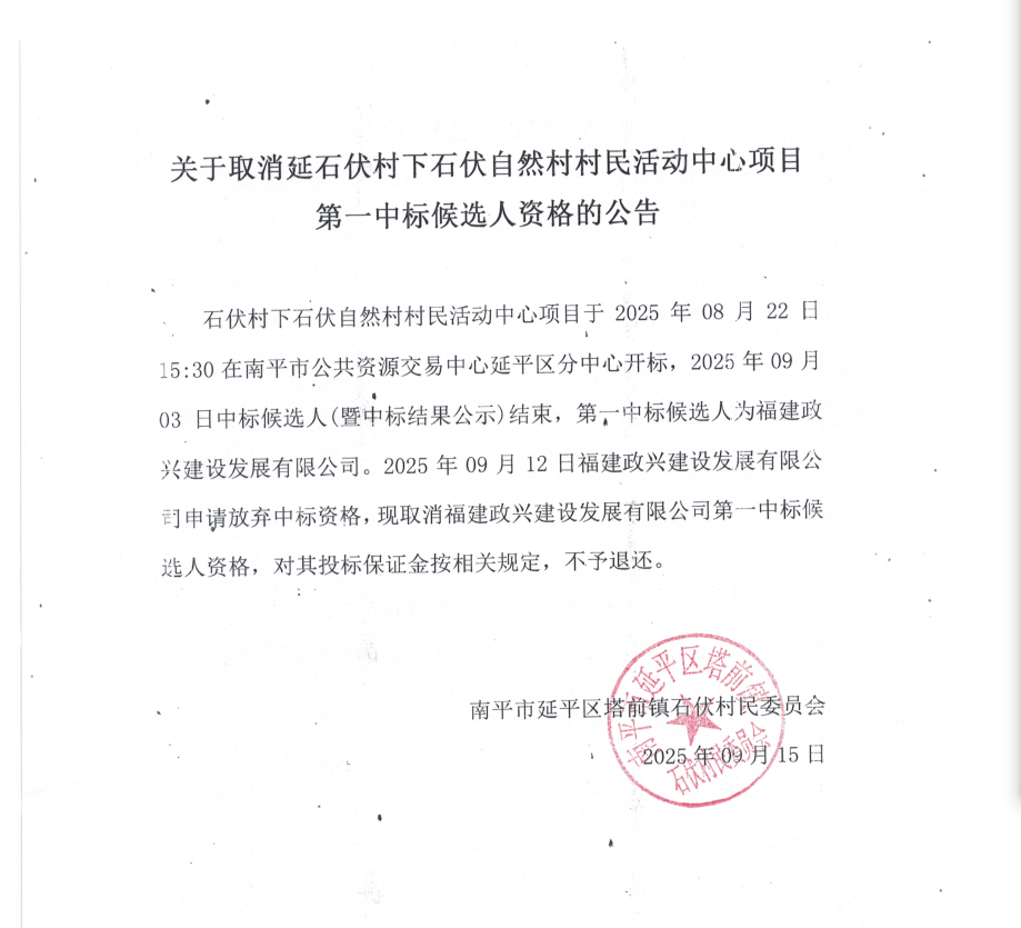 关于取消延石伏村下石伏自然村村民活动中心项目第一中标候选人资格的公告