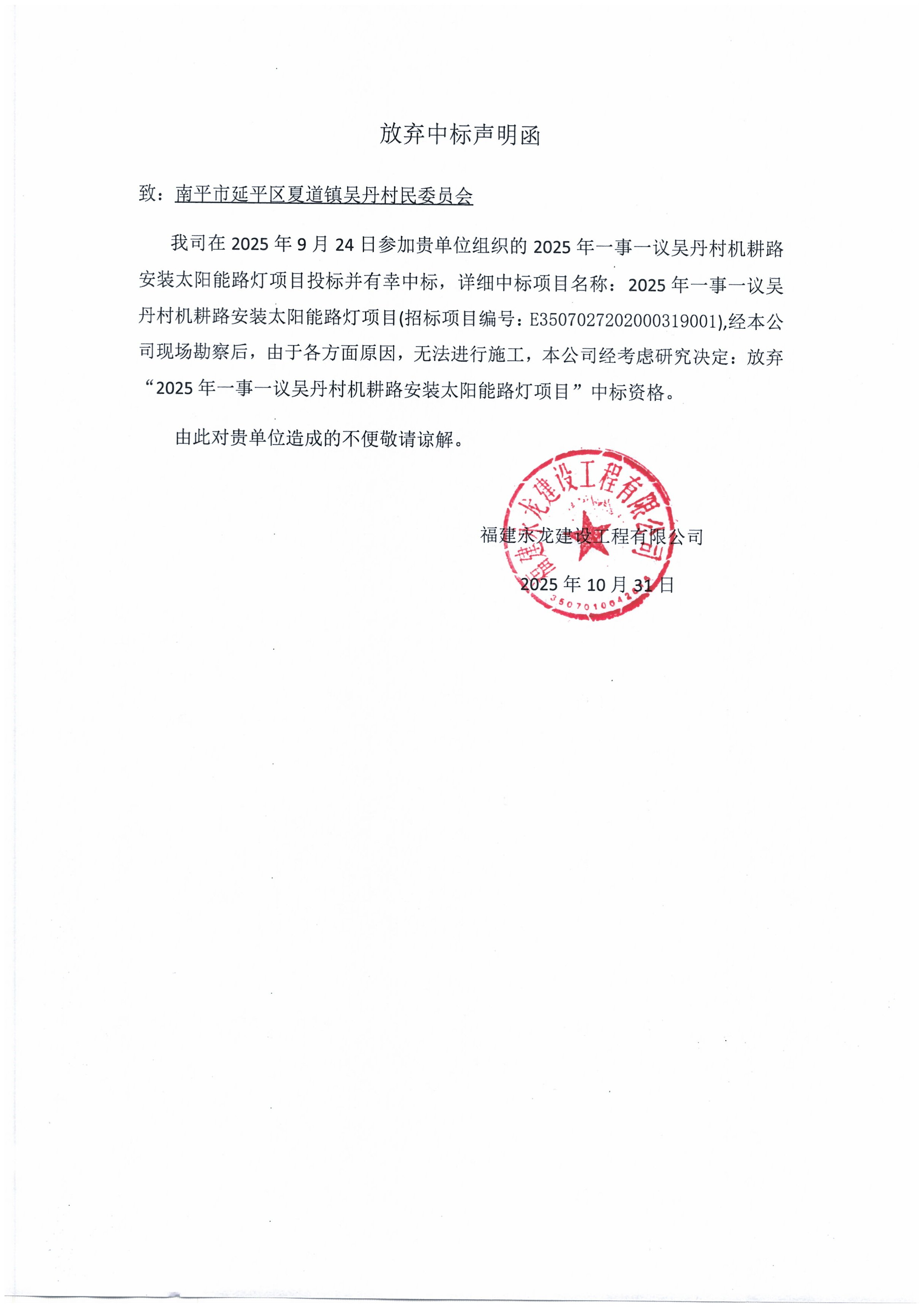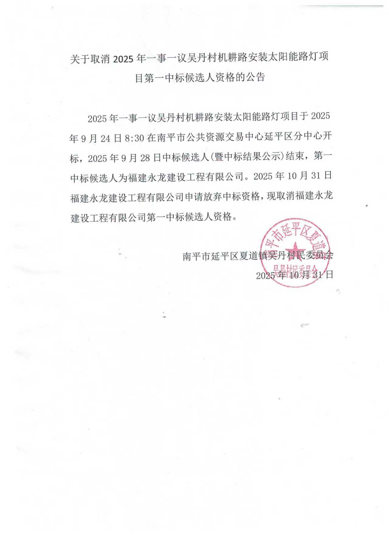 关于取消 2025年一事一议吴丹村机耕路安装太阳能路灯项目第一中标候选人资格的公告