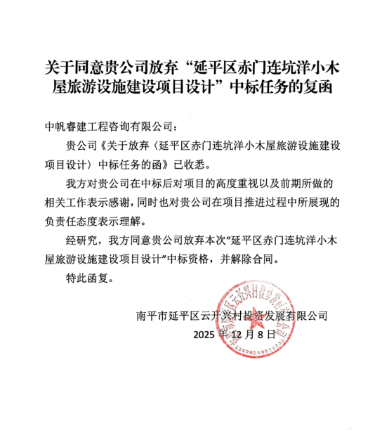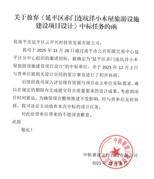 关于取消《延平区赤门连坑洋小木屋旅游设施建设项目设计》第一中标候选人资格的公告