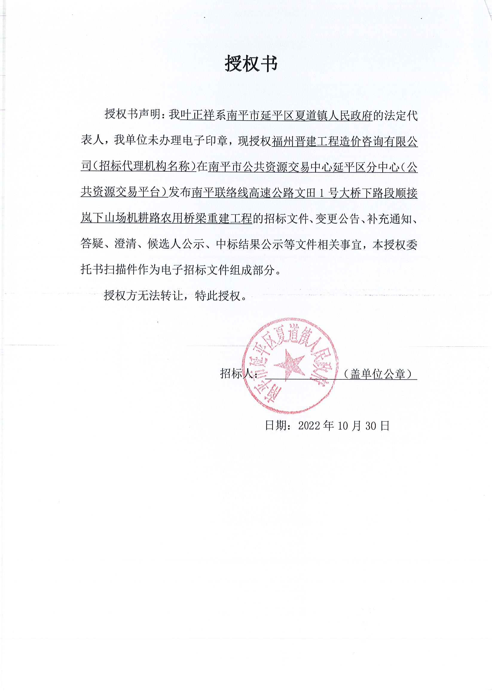 本招标项目南平联络线高速公路文田1号大桥下路段顺接岚下山场机耕路农用桥梁重建工程(项目名称)已由南平市延平区南平联络线高速公路建设指挥部(项目审批、核准或备案机关名称)以【2022】1号(批文名称及编号)批准建设,施工图设计已由中共南平市延平区夏道镇委员会(建设单位名称)以会议纪要夏委纪【2022】40号(审定文件名称及编号)审定。项目业主为南平市延平区夏道镇人民政府,建设资金来自专户资金(资金来源),出资比例为100%,招标人为南平市延平区夏道镇人民政府。项目已具备招标条件,现对该项目的施工进行公开招标,本次招标采用资格后审。