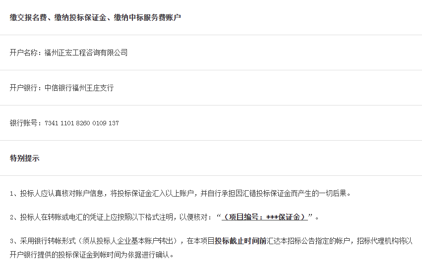 7.获取采购文件地点、方式:供应商可直接到福州正宏工程咨询有限公司购买竞争性谈判文件,若有异地购买竞争性谈判文件者,以对公转账汇款,但须在汇款凭证中注明本项目的项目编号或项目名称,同时将汇款凭证扫描件(或网银转账截图)、供应商单位名称、联系人、联系电话、拟报名合同包号等信息以电子邮件形式发送给招标公司电子信箱(1240382712@qq.com),以便确认相应项目的报名登记并为供应商办理后续竞争性谈判文件发送事宜。潜在供应商购买竞争性谈判文件时的单位名称应与报价时的单位名称一致,我公司不接受未购买竞争性谈判文件的潜在供应商的响应报价与质疑。